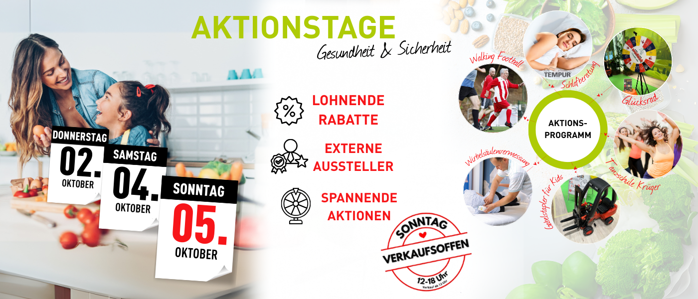 Wir laden euch herzlich zu unseren großen Aktionstagen ein! Unter dem Motto „Fit & sicher durchs Leben“ erwarten euch spannende Fachberatungen, Gewinnspiele und jede Menge Inspiration rund um Gesundheit und Sicherheit im Alltag.